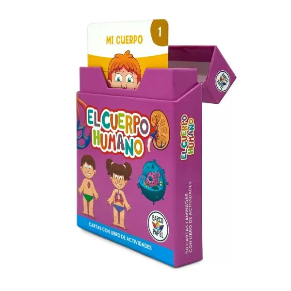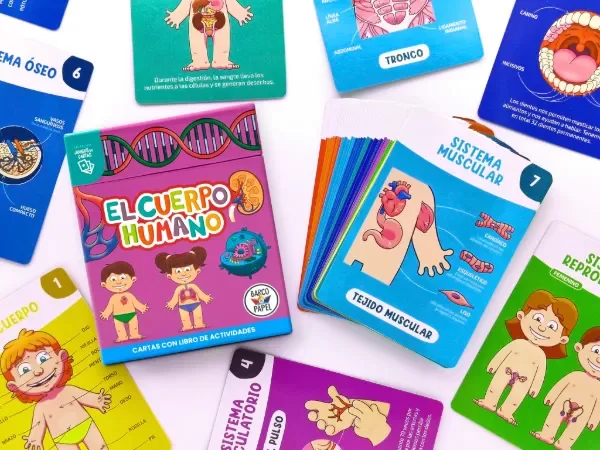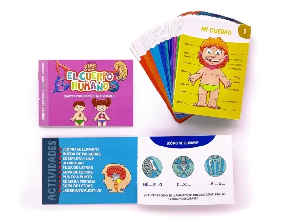 Las cartas del cuerpo humano traen en su dorso datos curiosos para aprender aún más y también vienen con un libro lleno de actividades.