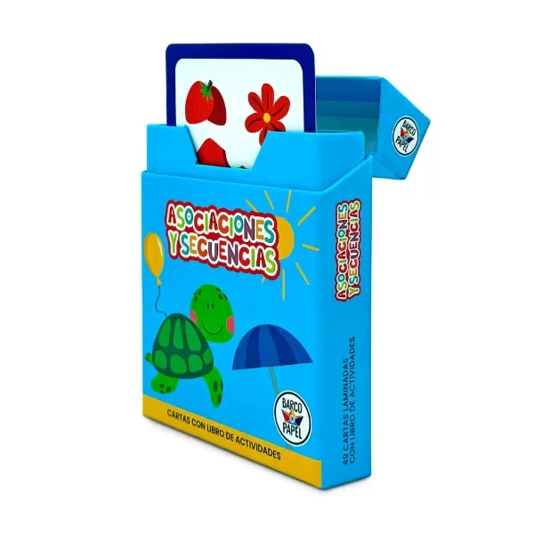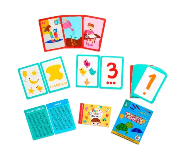 • 49 cartas educativas para trabajar asociaciones y secuencias donde se trabaja números, colores, objetos y escenarios comunes para los niños y niñas.