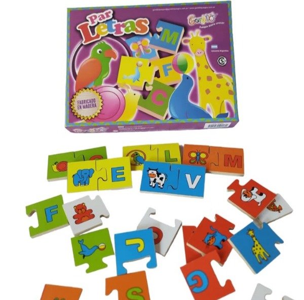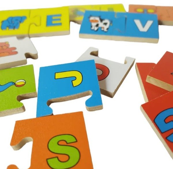 Este juego didáctico de fichas de madera ayuda a los niños a relacionar letras con imágenes de animales, desarrollando habilidades de lectura y lenguaje de forma divertida.